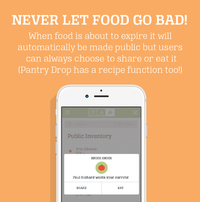 Pantry Drop is an app created to eliminate food waste through a community sharing service. The app is designed to minimize individual/household food waste and allow individuals to interact as an active participant within their community.